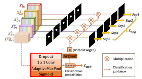 1. X5 Decoder에 Dropout - 1x1 Conv - AdaptiveMaxPool - Sigmoid를 통과 시킨다