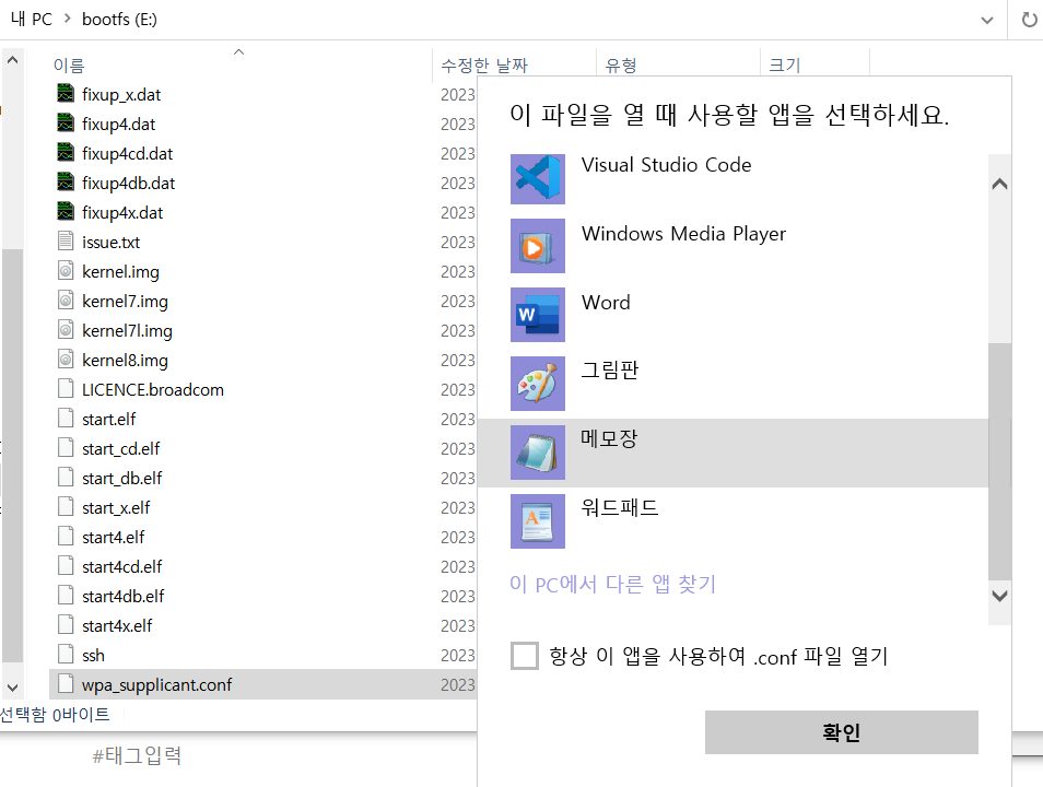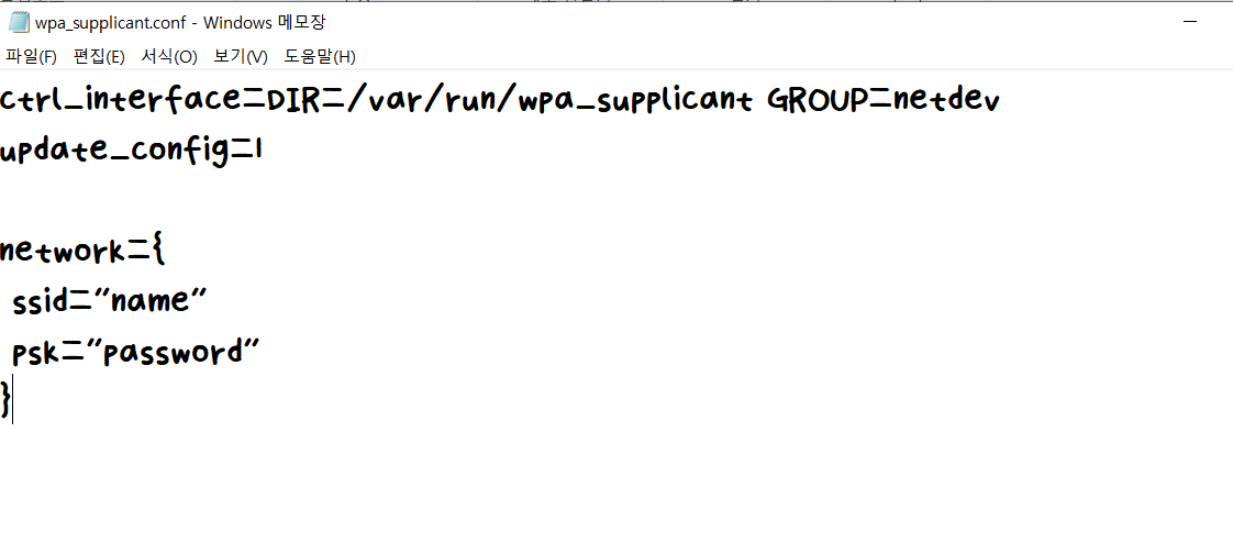 " wpa_supplicant.conf " 인 파일하나를 추가적으로 만들어 주고 메모장으로 열어준다