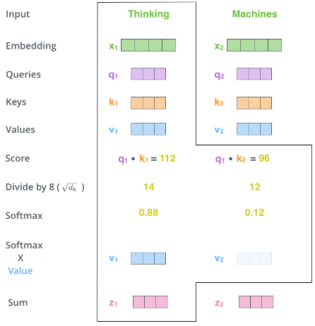 single head attention의 출력 z0를 만들어 낼때 다음과 같은 연산
