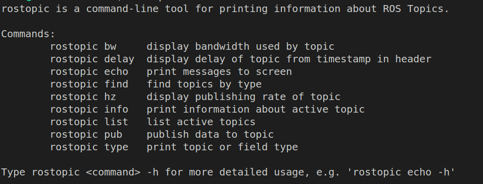 rostopic bw display bandwidth used by topic rostopic delay display delay of topic from timestamp in header rostopic echo print messages to screen rostopic find find topics by type rostopic hz display publishing rate of topic rostopic info print information about active topic rostopic list list active topics rostopic pub publish data to topic rostopic type print topic or field type