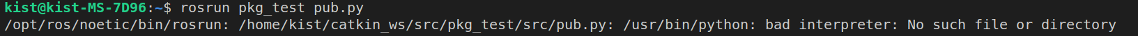 /opt/ros/noetic/bin/rosrun: /home/kist/catkin_ws/src/pkg_test/src/pub.py: /usr/bin/python: bad interpreter: No such file or directory