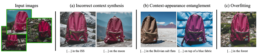 DreamBooth는 전체 parameter조정으로 인한 overfitting이 나타난거 같고 textual inversion은 치명적인 단점인 context를 유지 못한다는 것을 보여준다