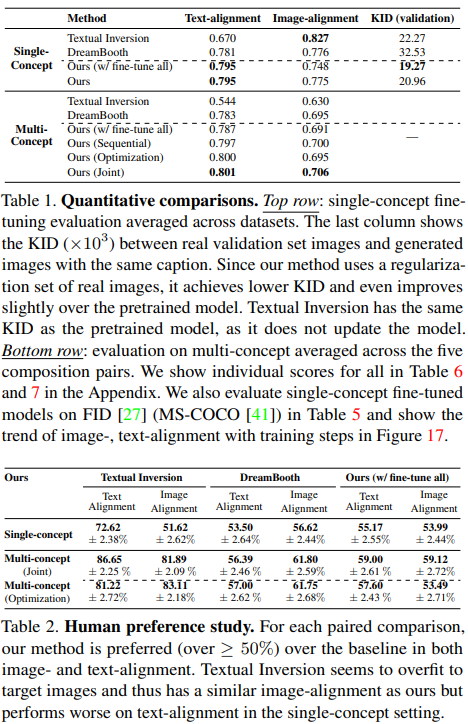 이 논문은 새로운 개인적인 개념학습 뿐만 아니라 두가지의 concept을 학습시키는 multiple concept 도 설명하고 있는데