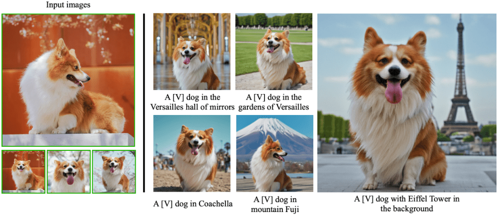 새로운 사진 몇장으로 기존 Pre-trained text-to-image diffusion model 이 기존에 없던 context를 만들어낸 것이랍니다