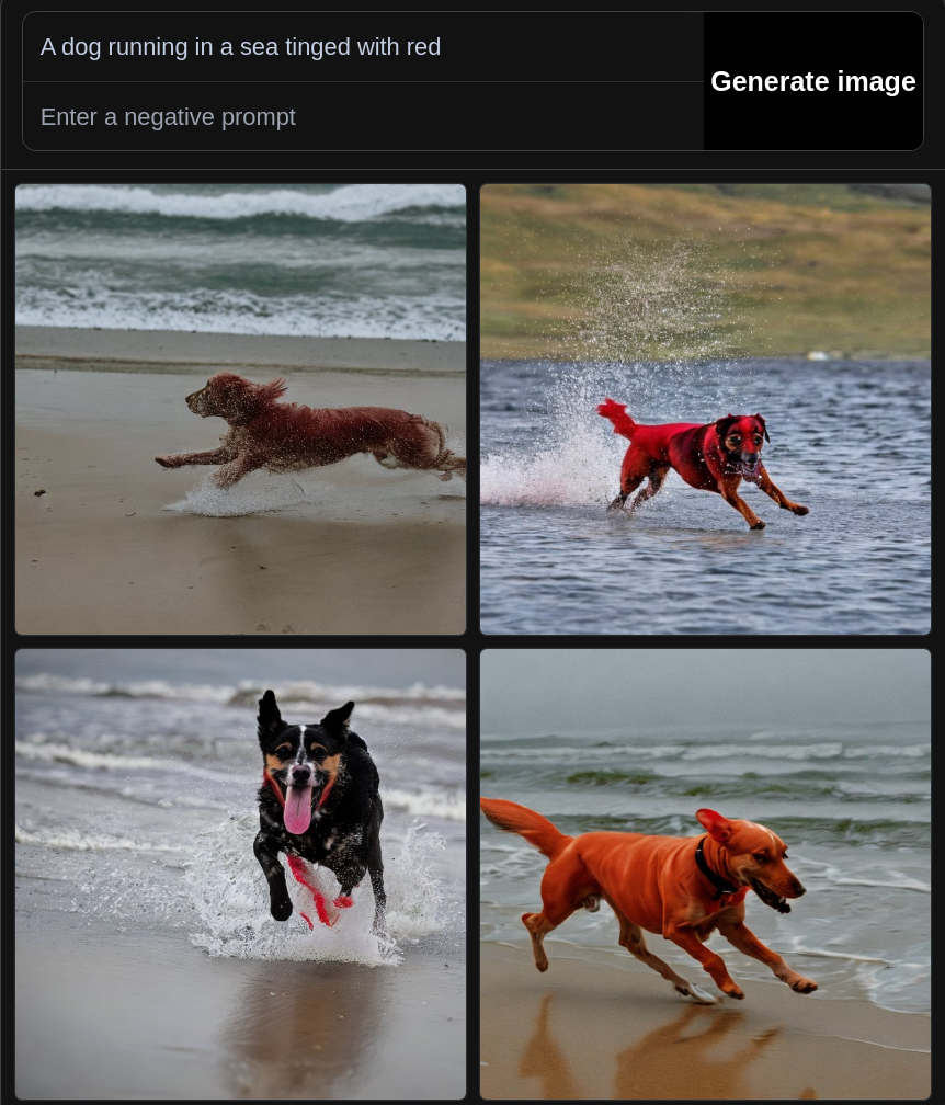 - 달리는 강아지를 그려줘 (one concept) -> 빨강색으로 물들고 있는 바다에서 달리는 강아지를 그려줘