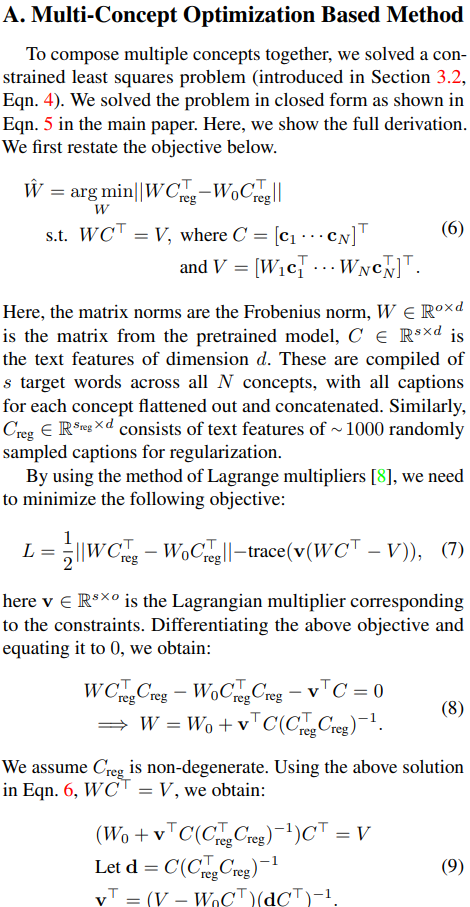 Intuitively, the above formulation aims to update the matrices in the original model, such that the words in target captions in C are mapped consistently to the values obtained from finetuned concept matrices