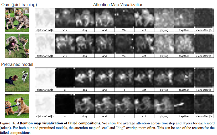As shown in Figure 11 in the paper, our method fails at difficult compositions like generating personal cat and dog in the same scene. We observe that the pretrained model also struggles with such compositions and hypothesize that our model inherits these limitations. Here, we analyze the attention map of each token on the latent image features in Figure 16. The “dog” and “cat” token attention maps are largely overlapping for both our and pretrained models, which might lead to worse composition.