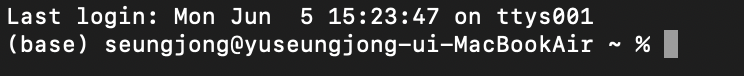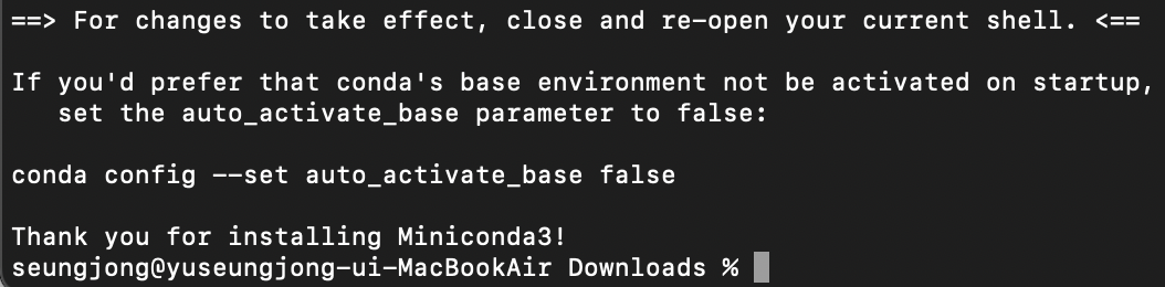 터미널을 다시 켜보면 (base)가 생기는 걸 볼 수 있는데 이거 끄고 싶으면