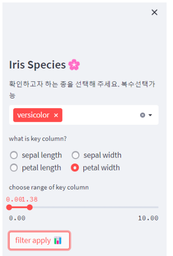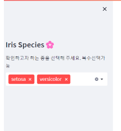 # 사이드바에 select box를 활용하여 종을 선택한 다음 그에 해당하는 행만 추출하여 데이터프레임을 만들고자합니다.
