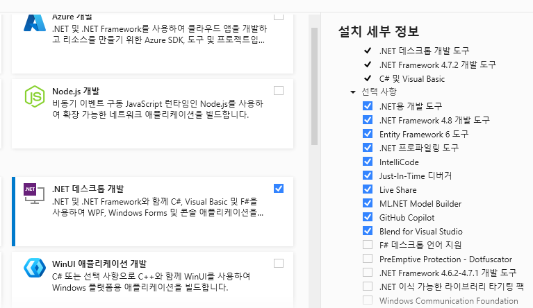 현재 공부하고 있는 책에서 '.NET 데스크톱 개발' 을 선택하라 해서 선택하였다 (7GB 정도 되네요)