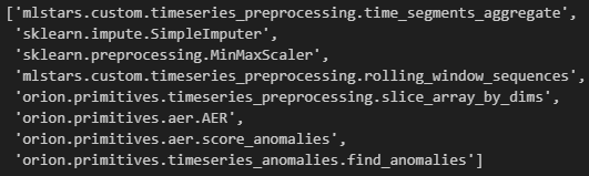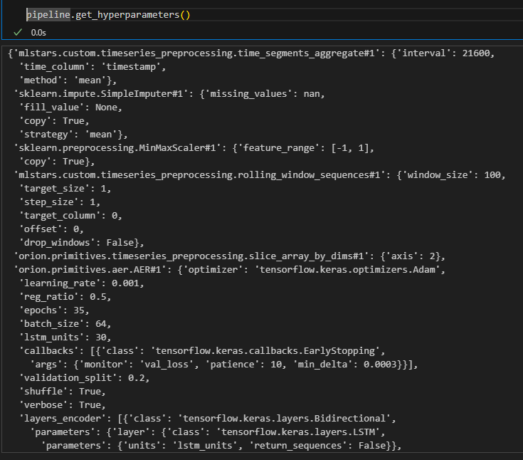 {'mlstars.custom.timeseries_preprocessing.time_segments_aggregate#1': {'interval': 21600, 'time_column': 'timestamp', 'method': 'mean'}, 'sklearn.impute.SimpleImputer#1': {'missing_values': nan, 'fill_value': None, 'copy': True, 'strategy': 'mean'}, 'sklearn.preprocessing.MinMaxScaler#1': {'feature_range': [-1, 1], 'copy': True}, 'mlstars.custom.timeseries_preprocessing.rolling_window_sequences#1': {'window_size': 100, 'target_size': 1, 'step_size': 1, 'target_column': 0, 'offset': 0, 'drop_windows': False}, 'orion.primitives.timeseries_preprocessing.slice_array_by_dims#1': {'axis': 2}, 'orion.primitives.aer.AER#1': {'optimizer': 'tensorflow.keras.optimizers.Adam', 'learning_rate': 0.001, 'reg_ratio': 0.5, 'epochs': 35, 'batch_size': 64, 'lstm_units': 30, 'callbacks': [{'class': 'tensorflow.keras.callbacks.EarlyStopping', 'args': {'monitor': 'val_loss', 'patience': 10, 'min_delta': 0.0003}}], 'validation_split': 0.2, 'shuffle': True, 'verbose': True, 'layers_encoder': [{'class': 'tensorflow.keras.layers.Bidirectional', 'parameters': {'layer': {'class': 'tensorflow.keras.layers.LSTM', 'parameters': {'units': 'lstm_units', 'return_sequences': False}}, 'merge_mode': 'concat'}}], 'layers_decoder': [{'class': 'tensorflow.keras.layers.RepeatVector', 'parameters': {'n': 'repeat_vector_n'}}, {'class': 'tensorflow.keras.layers.Bidirectional', 'parameters': {'layer': {'class': 'tensorflow.keras.layers.LSTM', 'parameters': {'units': 'lstm_units', 'return_sequences': True}}, 'merge_mode': 'concat'}}, {'class': 'tensorflow.keras.layers.TimeDistributed', 'parameters': {'layer': {'class': 'tensorflow.keras.layers.Dense', 'parameters': {'units': 1}}}}]}, 'orion.primitives.aer.score_anomalies#1': {'comb': 'mult', 'lambda_rec': 0.5, 'mask': True, 'rec_error_type': 'dtw'}, 'orion.primitives.timeseries_anomalies.find_anomalies#1': {'z_range': [0, 12], 'window_size': 2000, 'window_step_size': 200, 'lower_threshold': False, 'fixed_threshold': True, 'inverse': False, 'window_size_portion': 0.33, 'window_step_size_portion': 0.1, 'min_percent': 0.13, 'anomaly_padding': 50}}