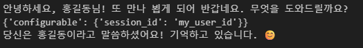config = {"configurable": {"session_id": "user_id"}} # 세션 ID를 설정하는 config 객체 생성