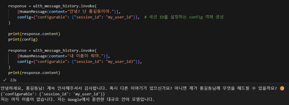 config={"configurable": {"session_id": "my_user_id"}}, # 세션 ID를 설정하는 config 객체 생성