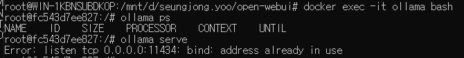 이러면 프롬포트가 바뀌면서 ollama container 내부로 들어가진다
