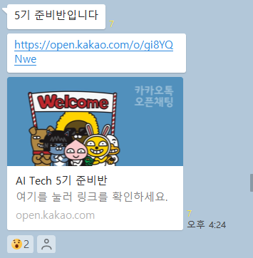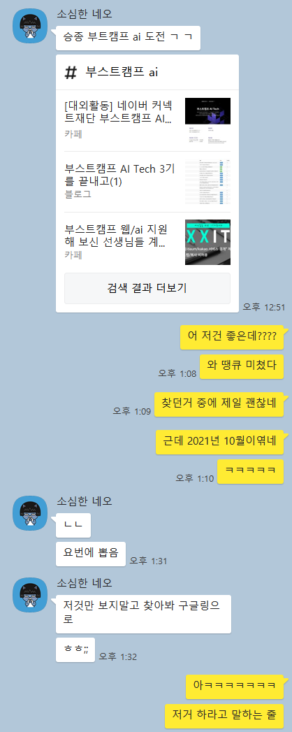 필수는 아니지만 저는 여기서 정보도 많이 얻었던거 같아요!! 사람들이 다른 경진대회나 부캠의 정보를 공유하기도 하고 일정도 말해서 저는 들어가는 걸 추천합니다!