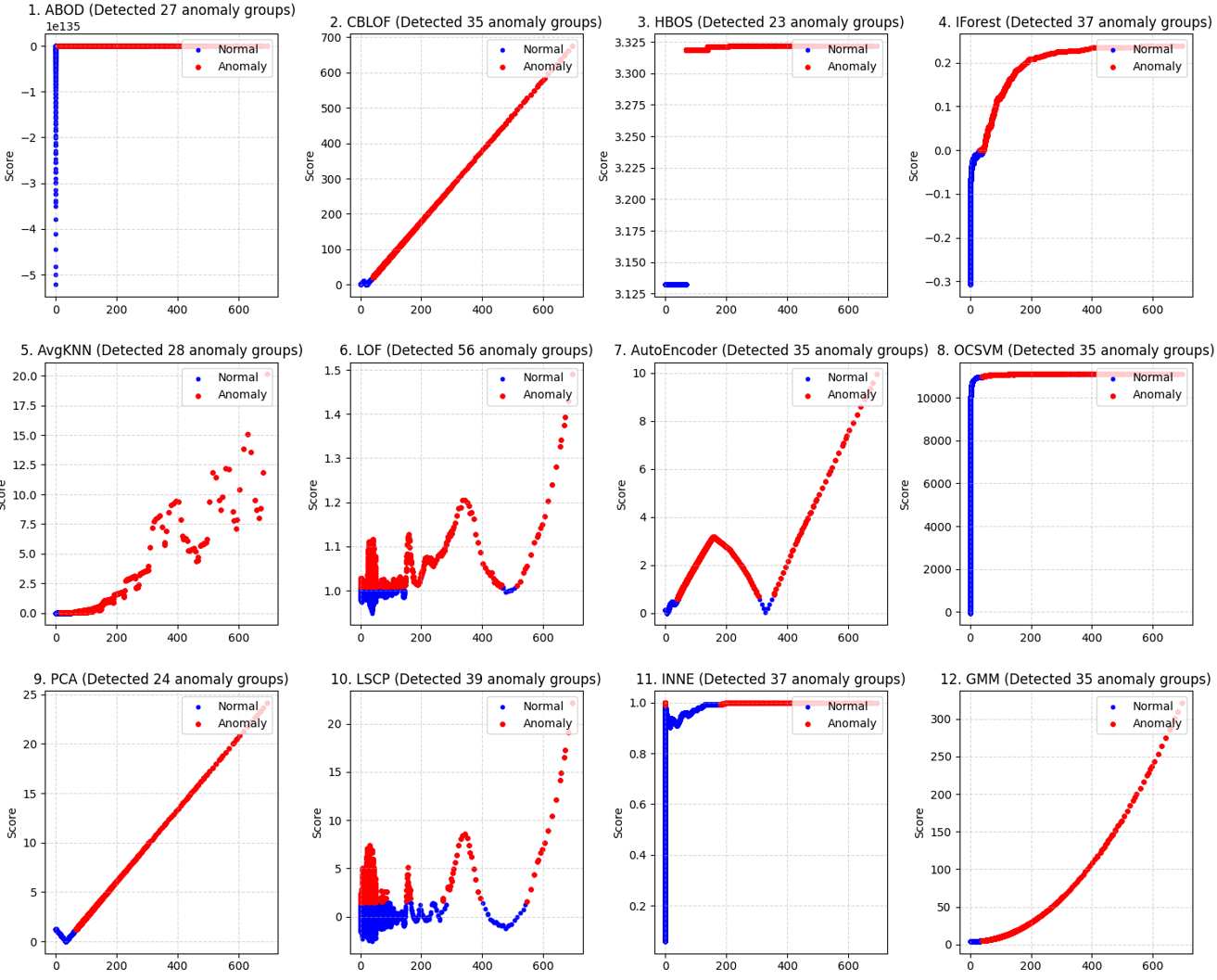 ABOD, ALAD, AnoGAN, AutoEncoder, CBLOF, COF, CD, CDPOD, DeepSVDD, ECOD, FeatureBagging, GMM, HBOS, IForest, INNE, KDE, KNN, LMDD, LODA, LOF, LOCI, LUNAR, LSCP, MAD, MCD, MO_GAAL, OCSVM, PCA, RGraph, ROD, Sampling, SOD, SO_GAAL, SOS, SUOD, VAE, XGBOD