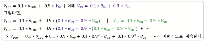 새로운 데이터(최근 데이터) 가 나올 수록 과거의 데이터는 a가 계속 곱해지게 되며 작아지게 된다