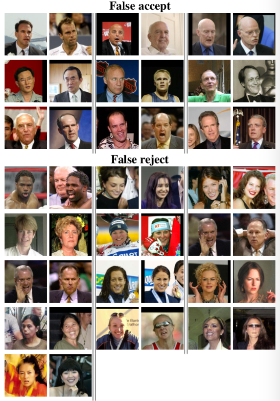 (매우 낮은 false accept rate에서, 하나의 잘못 라벨링된 이미지는 정확도 곡선에 메우 큰 영향)