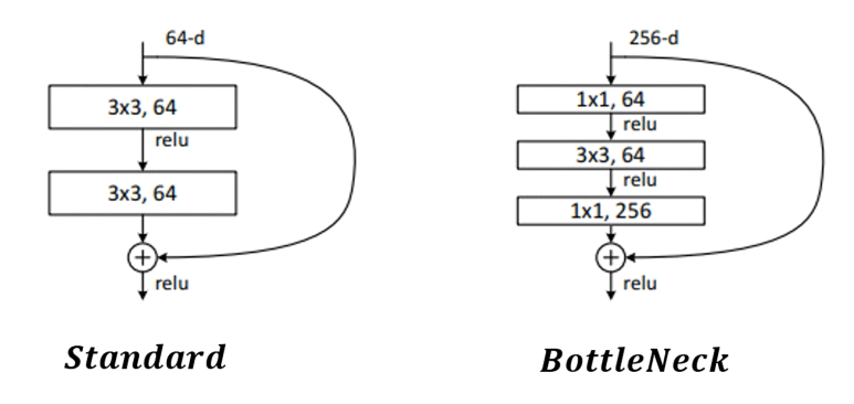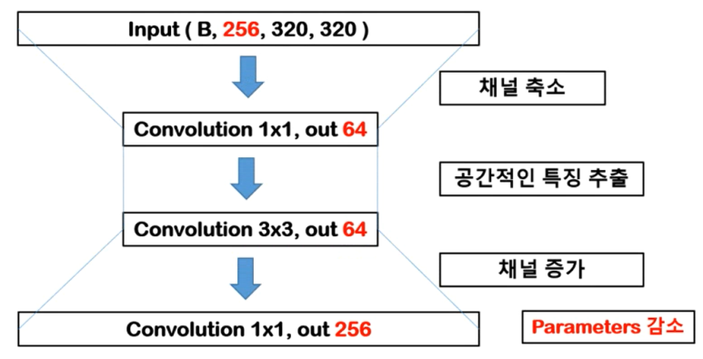 BottleNeck은 1x1, 3x3, 1x1 순으로 Convolution을 통과하고, Channel 수는 4배 정도 많지만, Parameter가 세 배 정도 적다.