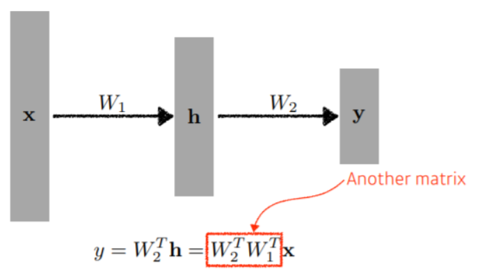 Nonlinear transform을 거치지 않으면 W를 몇개를 쌓아도 한개랑 차이가 없다 $$ W_{3} = W_{1}W_{2} $$