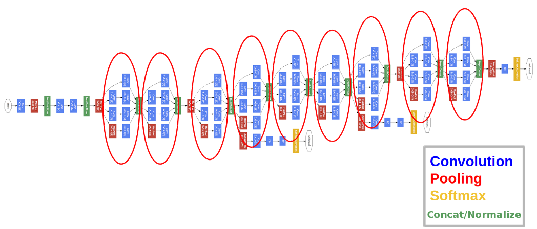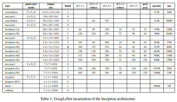 Here, the most successful particular instance (named GoogLeNet) is described in Table 1 for demonstrational purposes.