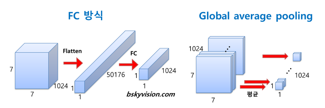 Global Average Pooling(GAP)을 사용하는 이유 : Softmax를 사용하고 싶어서 + Parameter 감소+ 쉬운 Fine Tuning