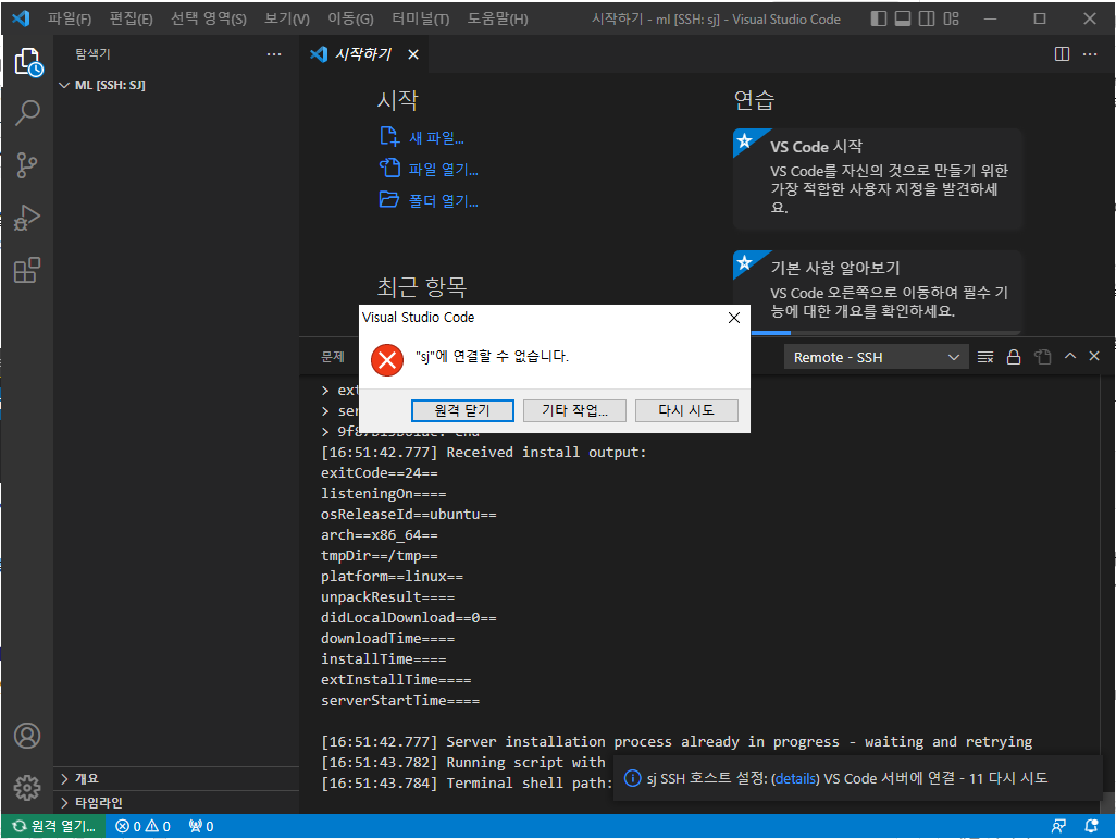 그다음 로컬의 vsc를 켠 다음 다시한번 서버에 연결을 해주면