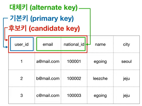 Alternate Key (대체키) :Candidate key들 중에서 선택받지 못한 key