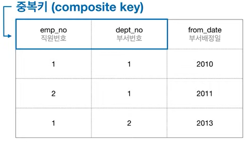 다음과 같이 직원 번호랑 부서 번호만으로는 행을 식별할 수 없다